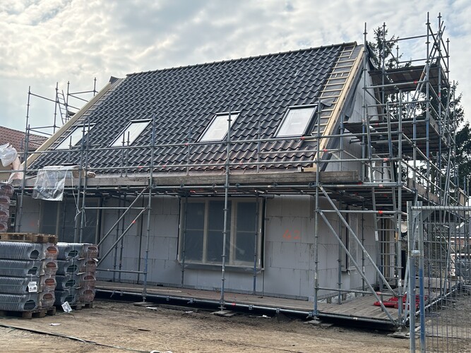De eerste daken zijn inmiddels geplaatst en is de aannemer gestart met het leggen van de dakpannen op het eerste blokje woningen. Volgende week komt de kap erop bij nog eens 4 woningen. Halverwege maart worden ook de trappen geplaatst. En zal er ook een start worden gemaakt met het metselwerk aan de buitenzijde van de woningen.