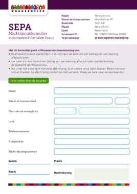 Ook uw huur betalen via automatische incasso? Vul dan het machtigingsformulier in. Met dit machtigingsformulier geeft u Woonservice toestemming om de huur automatisch van uw rekening te schrijven.