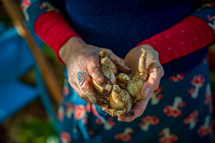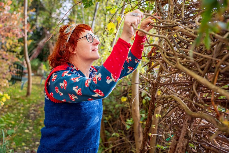 “Toen ik hier kwam wonen, dacht ik meteen: hier moet meer groen komen. Voor mijn eigen privacy, voor de planeet en voor allerlei dieren. Als ik buiten ben, wil ik in de natuur staan.” De tuin ontstond zonder plan. “Ik ben van het doen en denken tegelijk,” lacht Marjan. “Ik had een aantal bomen en ik heb ze gewoon hier en daar neergezet. Als het niet goed staat, verplant ik ze weer.” Grasmaaien is niet haar favoriete bezigheid, dus het gras maakte al snel plaats voor bloemen, planten en straks ook biologische voorjaarsbloemen.