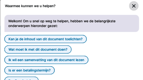 Onderaan de pagina vindt u de knop ‘Waarmee kunnen we u helpen?’. Als u hierop klikt, ziet u een menu met extra mogelijkheden. U kunt bijvoorbeeld een samenvatting van de brief bekijken, een vraag stellen voor meer uitleg of de tekst laten vertalen.