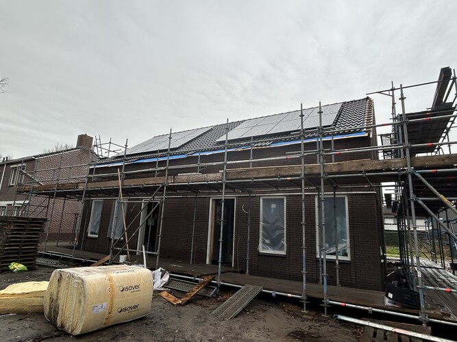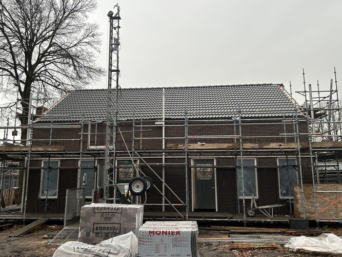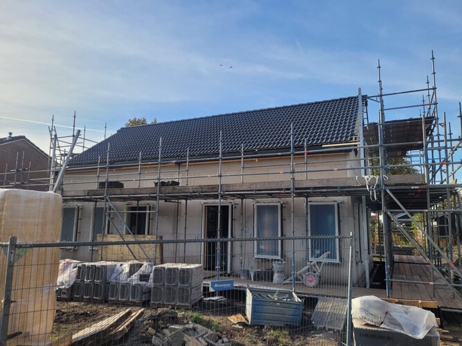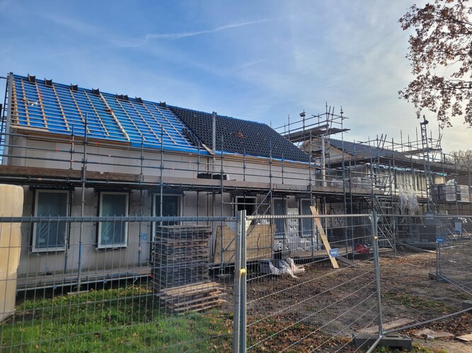 Alle woningen zijn inmiddels voorzien van prefab dakconstructies en ook de dakpannen zijn gelegd op de woningen. Het metselwerk aan de buitenzijde is ook afgerond en de goten zijn aangebracht.