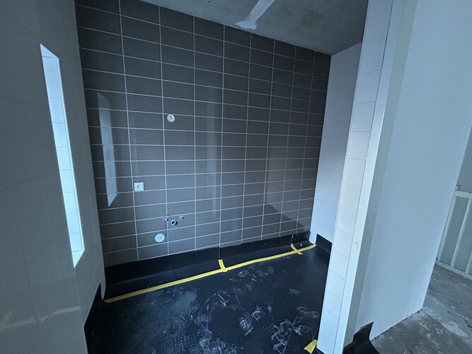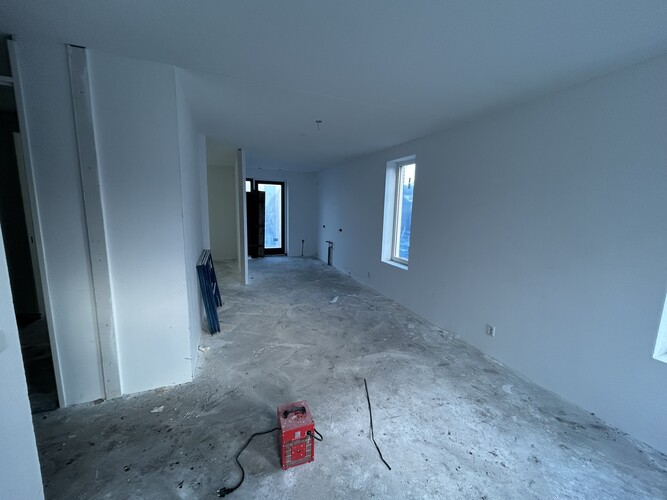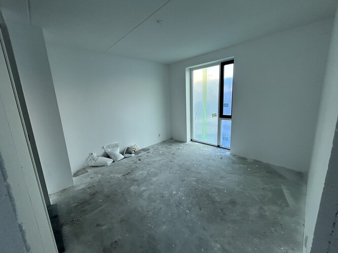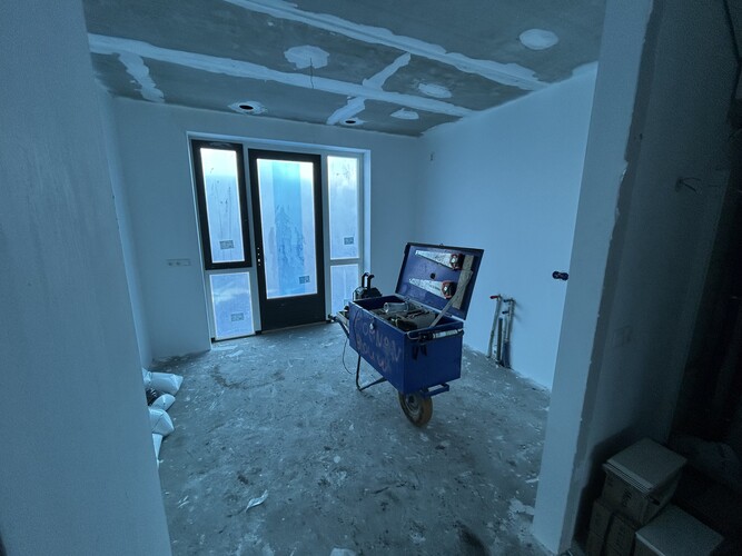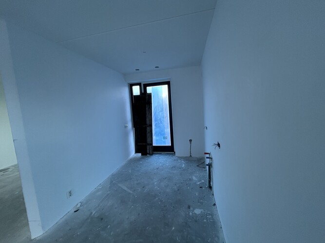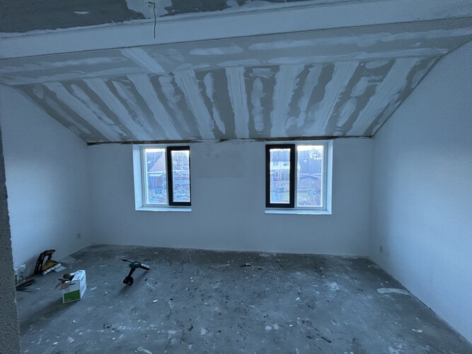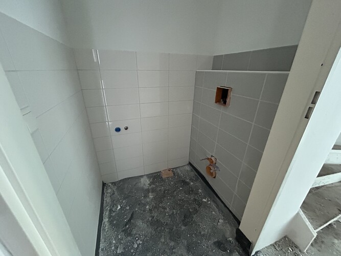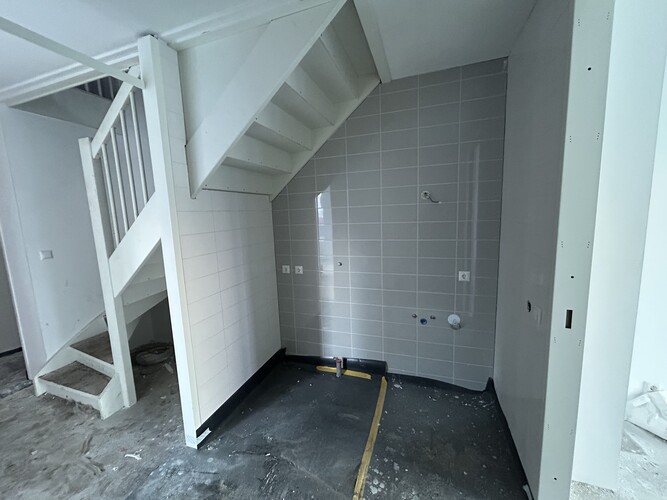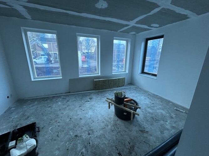 De stucadoor is op dit moment ook aan het werk met het spackwerk aan de binnenzijde van de woningen. Aan de binnenzijde is het tegelwerk van de woningen klaar.
